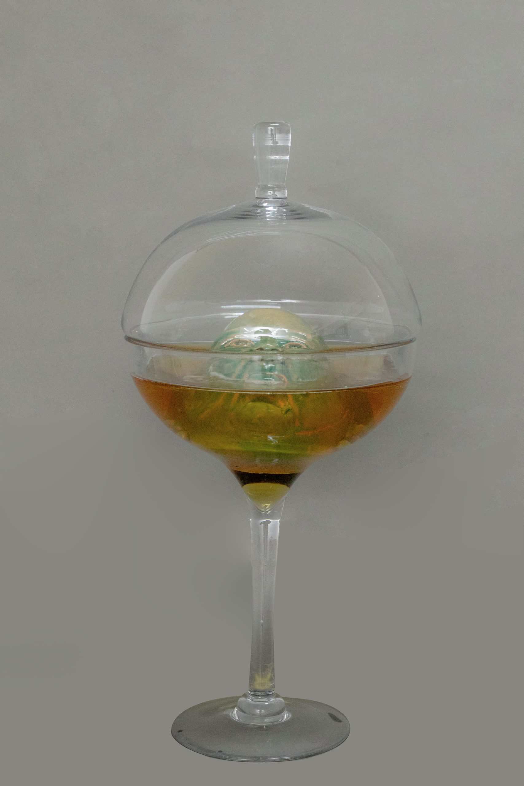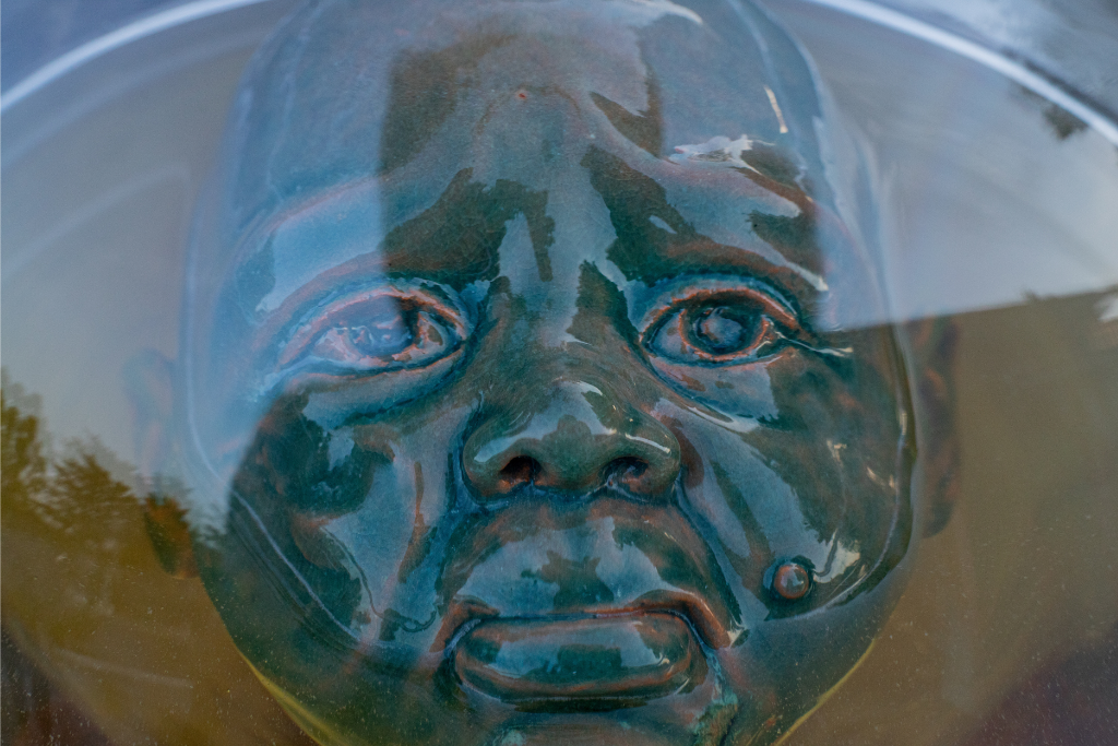 Drunkenness is a sculptural and installation artwork composed of a large coupe glass in which a child’s face, made of glazed terracotta, is placed. The head, partially submerged in beer, appears to float on the surface of the liquid, creating a visual tension between the purity of the childlike figure and the alcoholic substance surrounding it.
