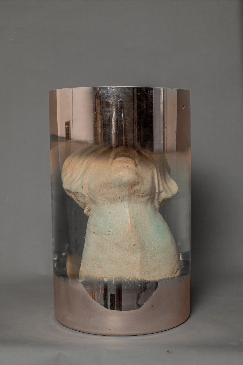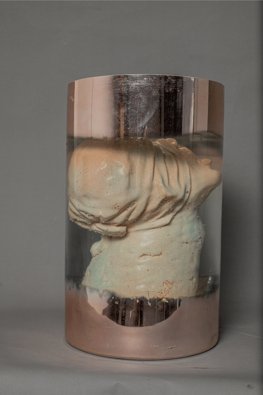 In the Mediterranean is a sculpture-installation presented inside a glass with slightly blurred edges, within which sits a glazed terracotta human head. The face is wrapped in bands covering parts of it, while the mouth is wide open. The entire piece is fully submerged in water, creating a scene that is both silent and striking.