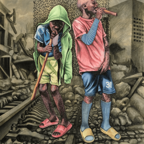 Appearance Can Be Deceiving showcases a vibrant and intricate composition. The central figure, a woman with her head resting on her hand, is adorned in a colorful headwrap and glasses. Her body is covered in patterns that resemble product labels or advertisements, adding texture and depth to her form. The background features a blue map with various routes and landmarks, giving the impression of an interconnected urban environment. The contrast between the colorful patterns on the figure and the detailed map highlights the theme that appearances can be deceiving, suggesting a deeper narrative beneath the surface.
