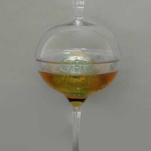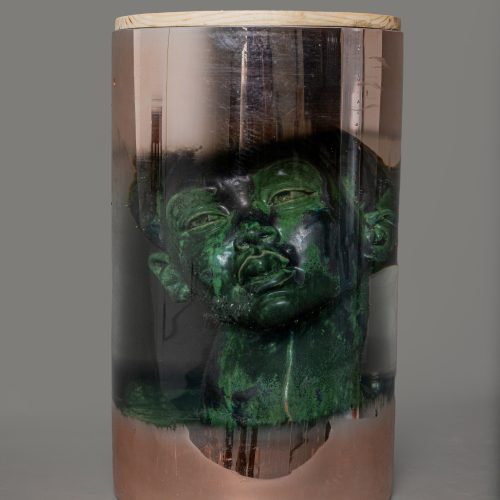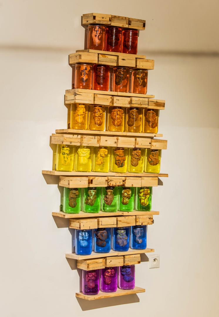 “Innocence at the Peril of the Soul” is a wall-mounted ceramic installation composed of thirty glass bottles fixed onto a wooden structure. Each bottle contains colored water and a small glazed terracotta sculpture representing a fetus. The ceramic forms are submerged in the liquid, giving the impression of being suspended in a fragile, enclosed space.