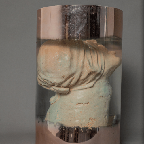 The repetition of the bottles creates a visual rhythm, transforming the installation into a sort of constellation of images. Each container acts as an autonomous space where the figure of the fetus is isolated from the outside world. The glass, transparent yet sealed, functions as a symbolic boundary between the interior, associated with gestation and the origin of life, and the exterior. In this work, the fetus represents the innocence and vulnerability of a life yet to come. The repeated presence of these forms emphasizes the idea that these potential lives do not yet have the capacity to make decisions about their own destiny. The installation thus evokes situations in which crucial choices belong to the people carrying the pregnancy.