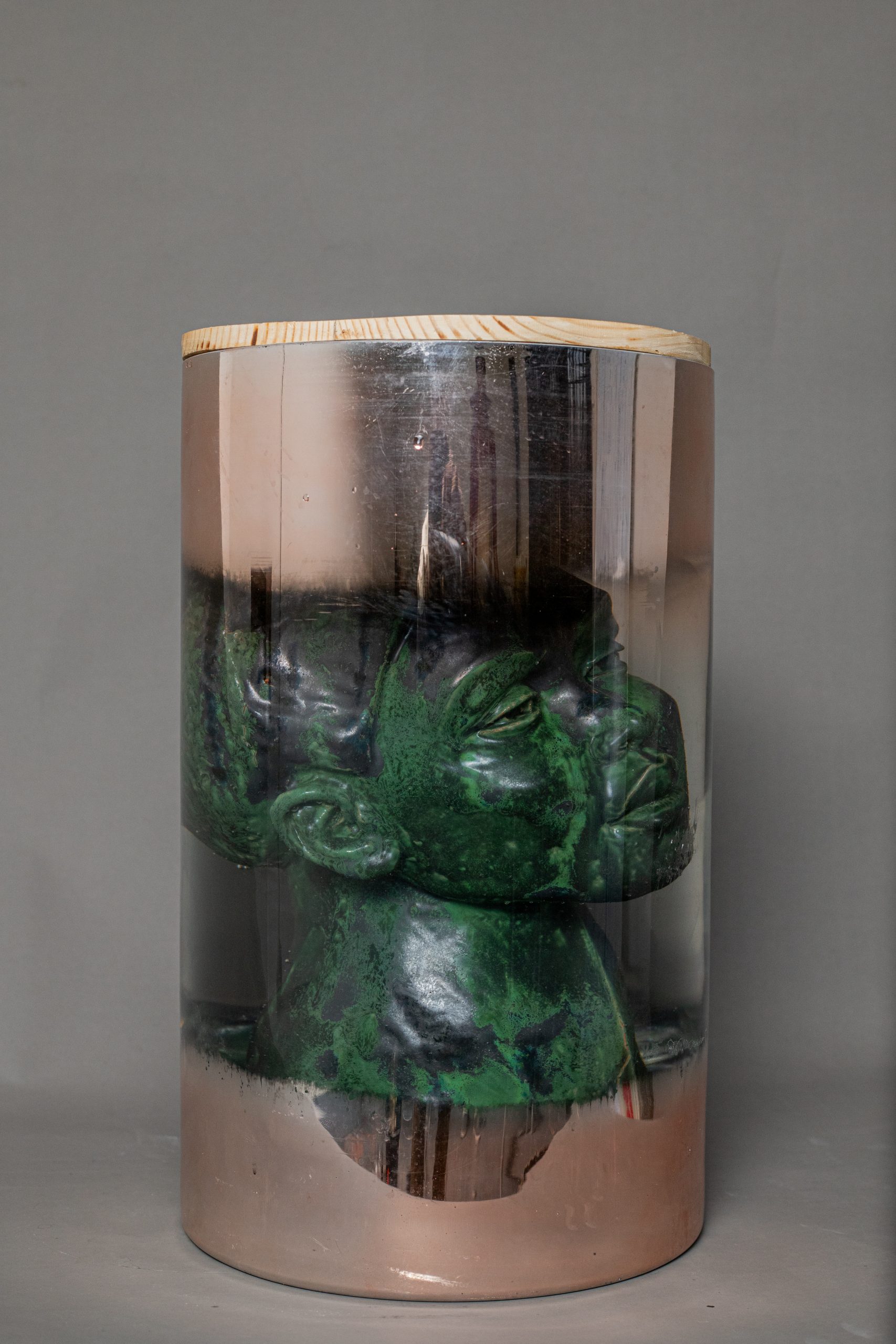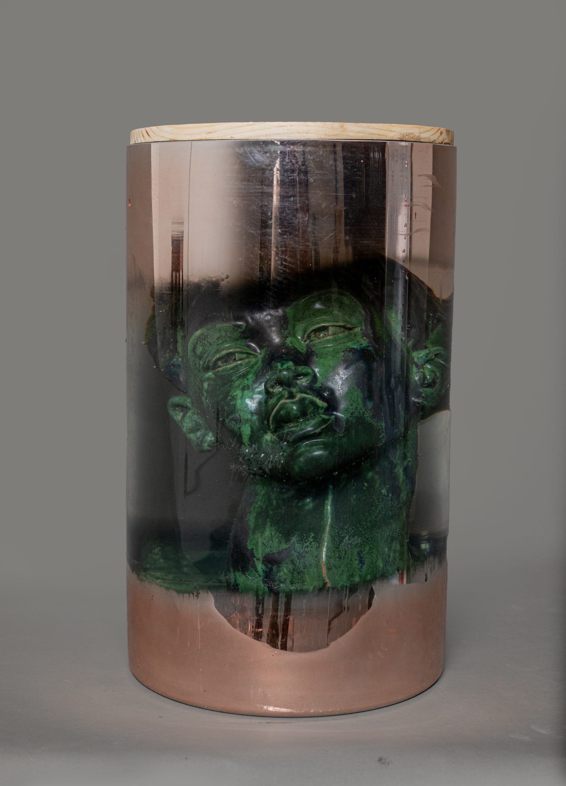 “Mayday” is a sculpture-installation composed of several materials glazed terracotta, water, glass, and wood arranged in a simple yet meaningful setup. The work takes the form of a glass with slightly blurred edges, placed on a wooden base. Inside the container is a woman’s head made of fired and glazed terracotta, with a coppery hue. The head is tilted and fully submerged in water.