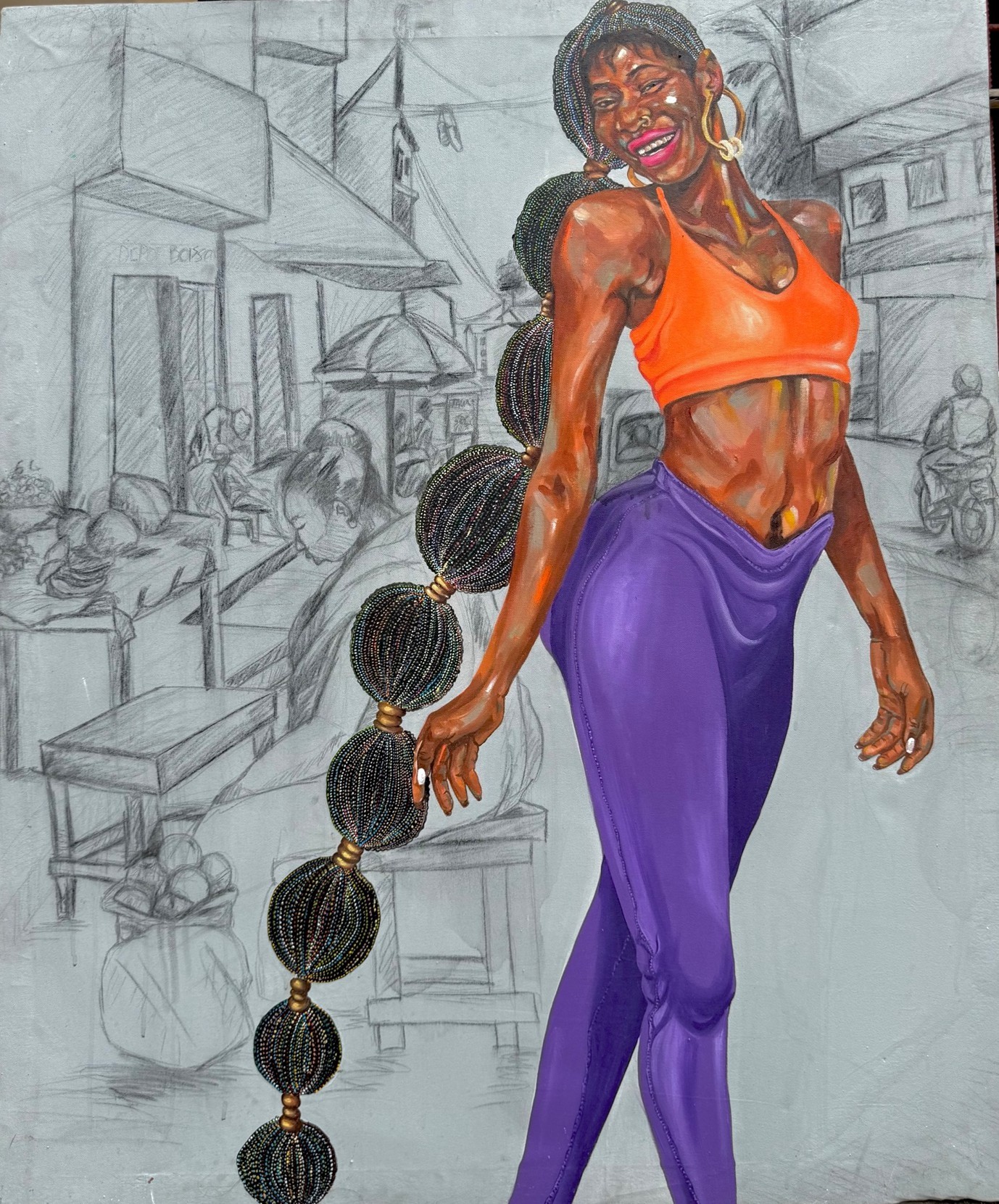 Sketched, a young woman, richly coloured, brimming with confidence and joy. This visual hierarchy positions the individual as the creator of their own reality. The bubbly, almost architectural braids act as an organic signature that ties in with modernity. Her gait is an affirmation, and her smile is a victory over the dreariness of routine.